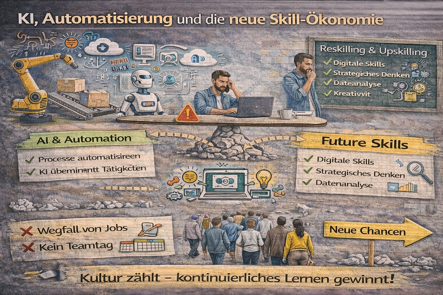 Gleichzeitig entstehen neue Rollen: KI-Produktverantwortliche, Prompt- und Workflow-Designer, Data Stewards, Governance- und Compliance-Profile. Und auch klassische Rollen verändern sich: Recruiter werden stärker zu Talent Advisors, Controller zu Business-Partnern, Marketer zu Growth- und Experiment-Teams. Der Arbeitsmarkt wird damit dynamischer – mit schnellerer Halbwertszeit einzelner Skills.